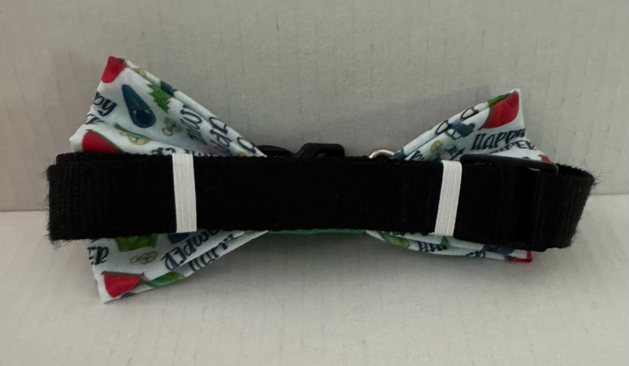 Bow tie is made with a cotton fabric, interfacing and has 2 pieces of elastic sewn into the back of the Bowtie that fits around your dog's collar. All bows are handmade from the same fabric but may have slight pattern variations.